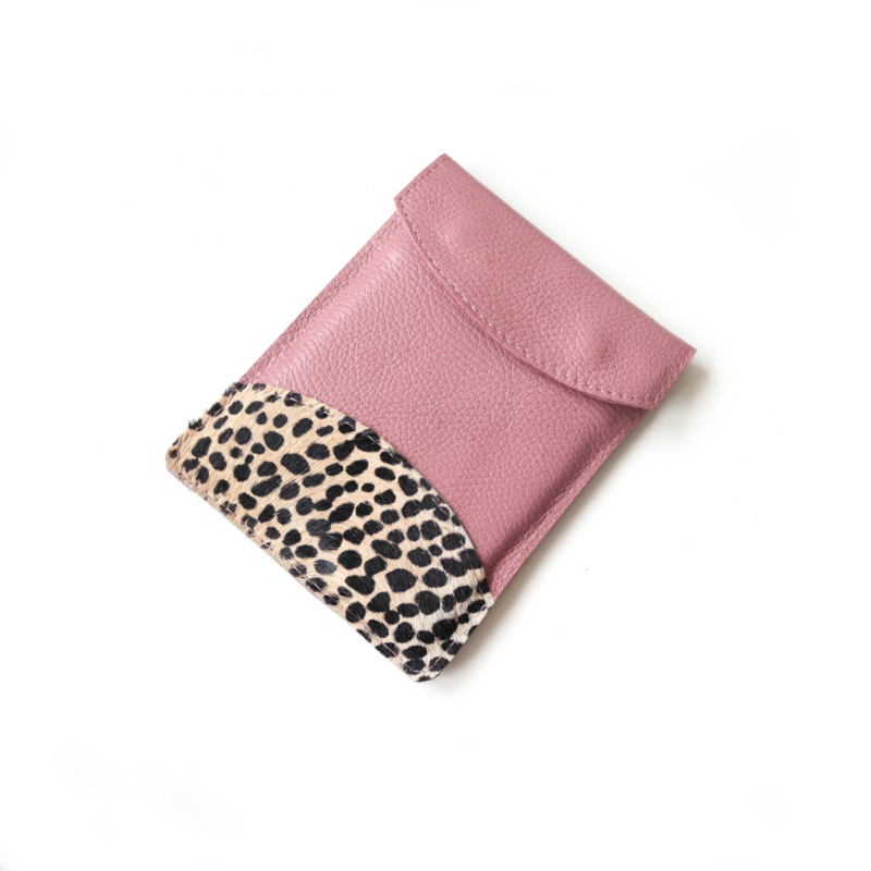 De hoes is ongevoerd en sluit met 2 magneetjes. Het voorbeeld is gemaakt oranje en roze leer, de ander van cognac kleur en harige cheetah print. Je kan de kleuren zelf samenstellen.