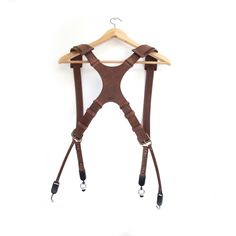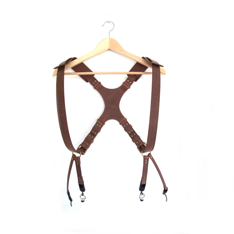 Stoer cameraharnas in bruin stevig leer. Over elke schouder draag je een camera die vrij kan bewegen over de schouderband. Het bruine leer is wat stugger maar wordt bij gebruik wel soepeler.